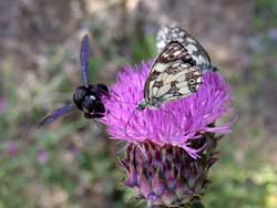 Farfalla (Melanargia gelathea?) e Imenottero (Xilocopa?) su fiore di
