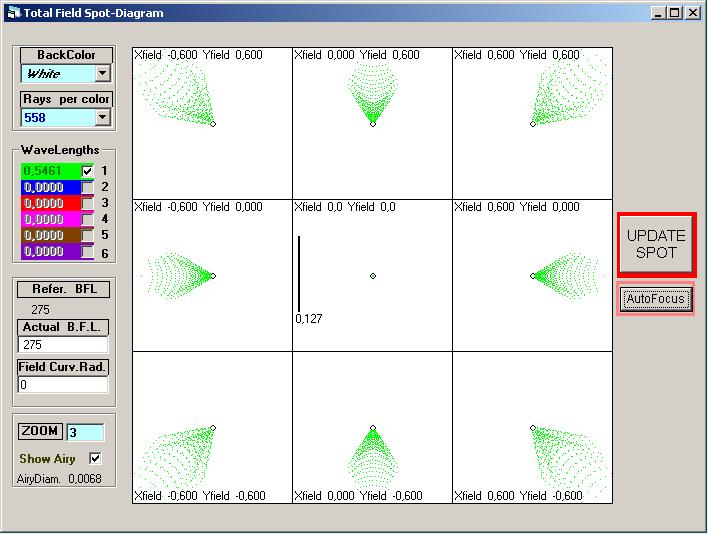 Leggo che, nelle tue considerazioni sugli oculari, non hai tenuto conto del coma, che in un Newton parabolico come il tuo deforma pesantemente le immagini stellari a partire da pochi millimetri di distanza dall'asse ottico. Pubbluico un Total Field Spot Diagram che mostra la fortissima deformazione e dilatazione delle immagini stellari in un campo del diametro di circa 30mm, che a quella focale corrisponde più o meno ad un campo angolare di 1.2 gradi.
