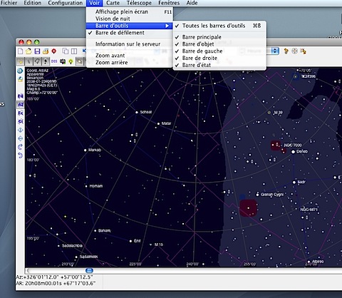 Ma si sa, di solito ci si trova a fare osservazioni in compagnia e spesso i monitor dei computer portatili sono molto fastidiosi a causa della forte luminosità, danneggiando soprattutto chi effettua osservazioni visuali. Cartes du Ciel può impostare la classica visualizzazione notturna tipica di molti programmi astronomici, colorando di rosso l’intero schermo.